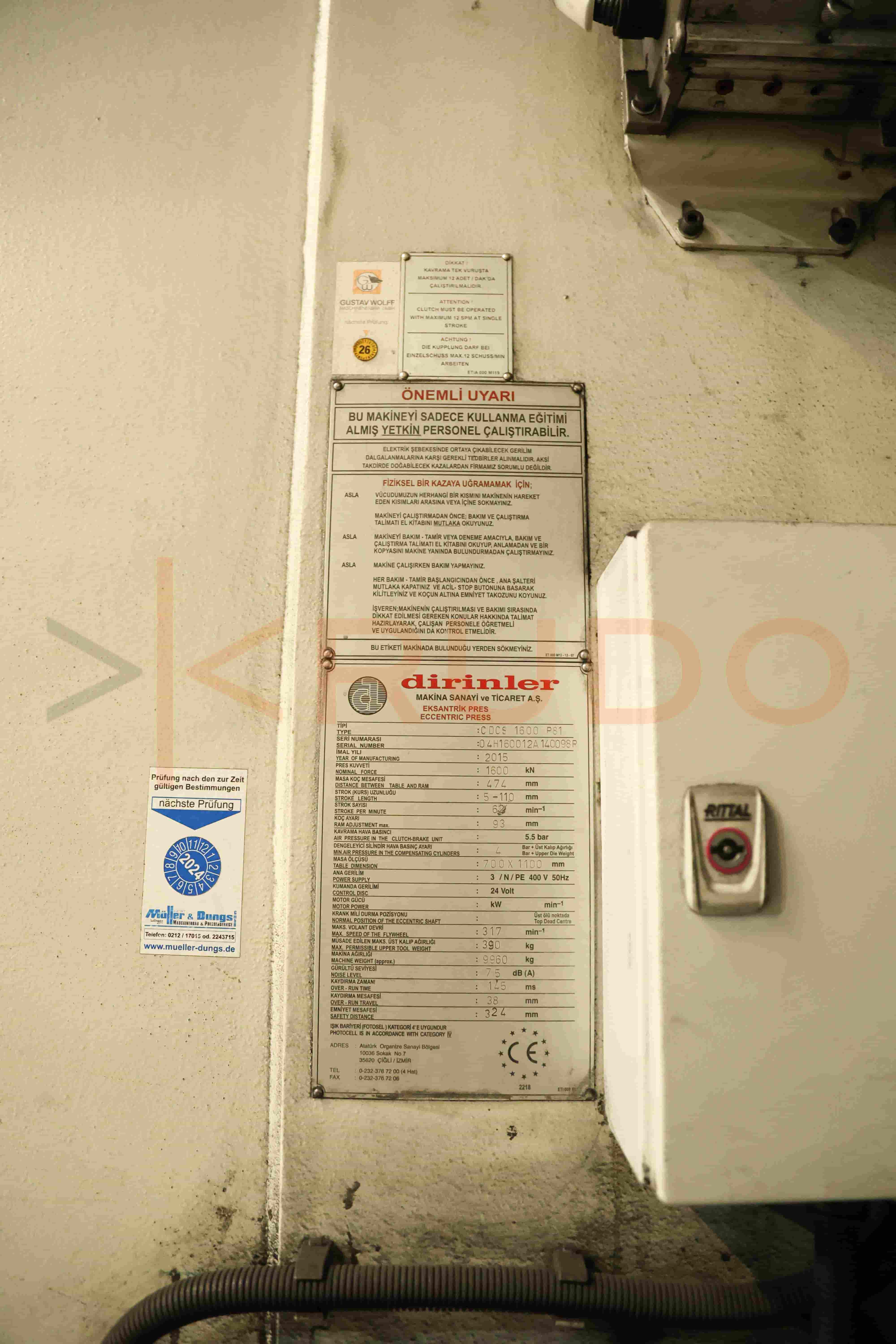This 2015 Dirinler eccentric press is a modern, high-speed production unit capable of delivering 1,600 kN of force with a fixed stroke rate of 62 per minute.