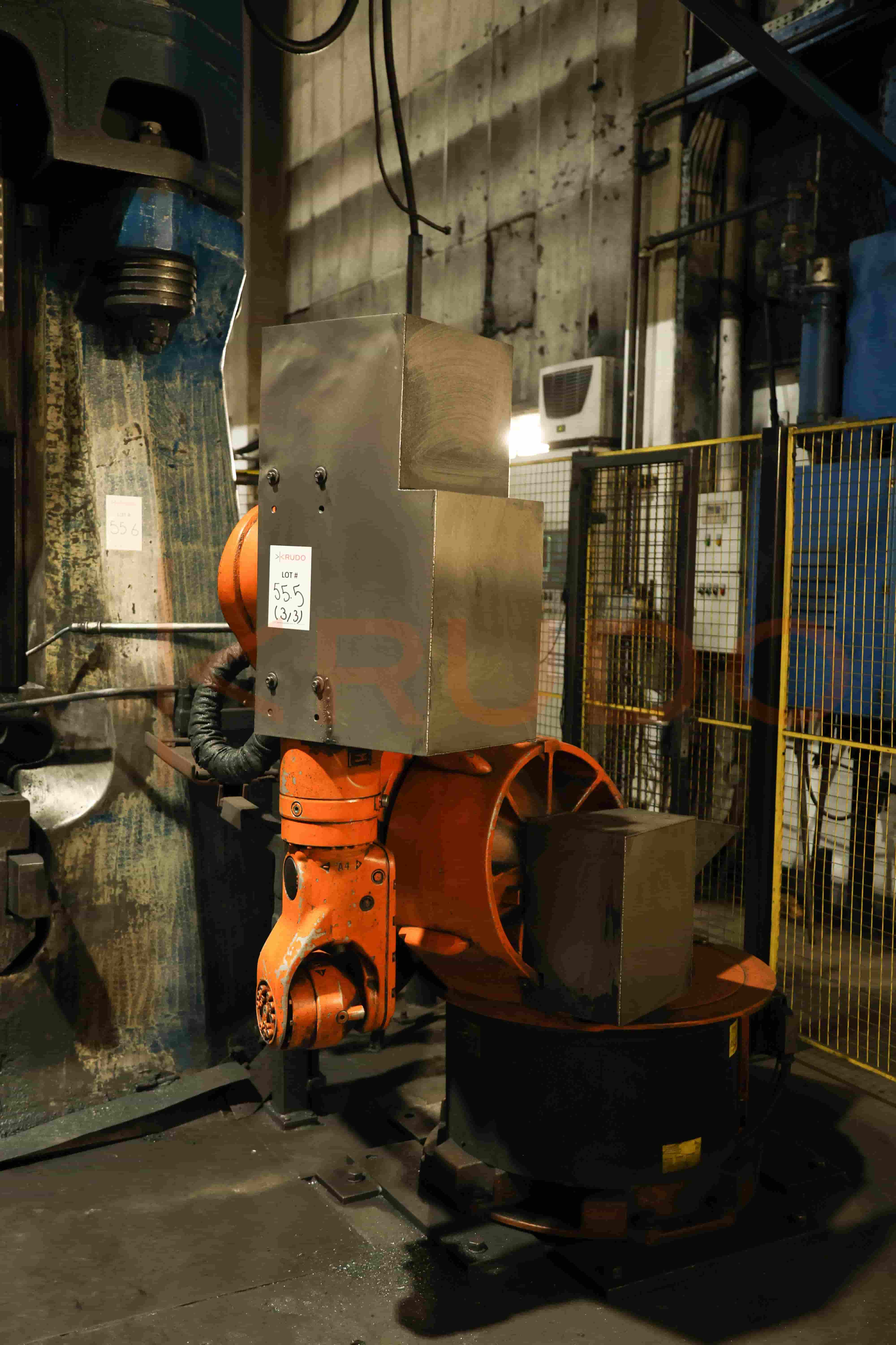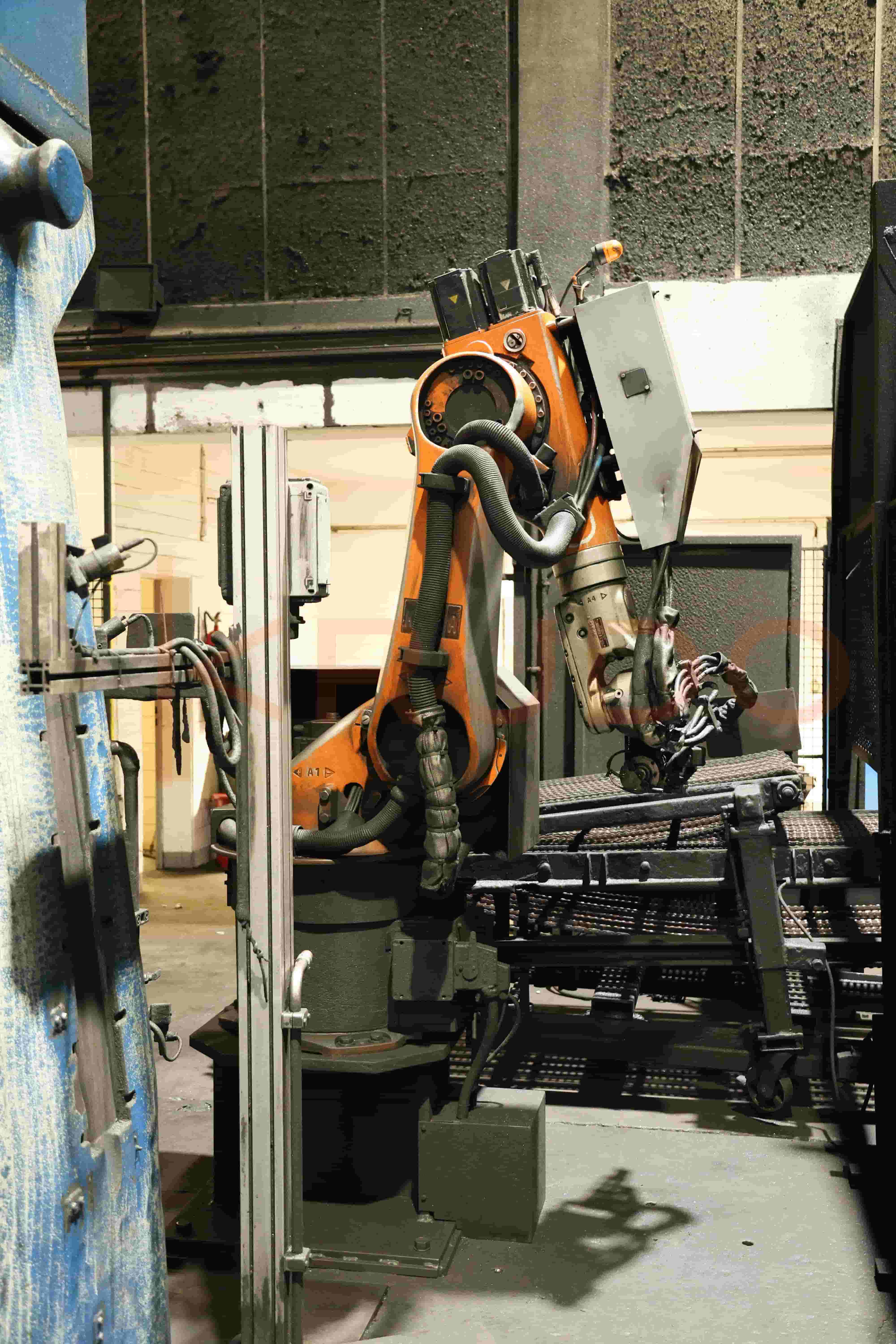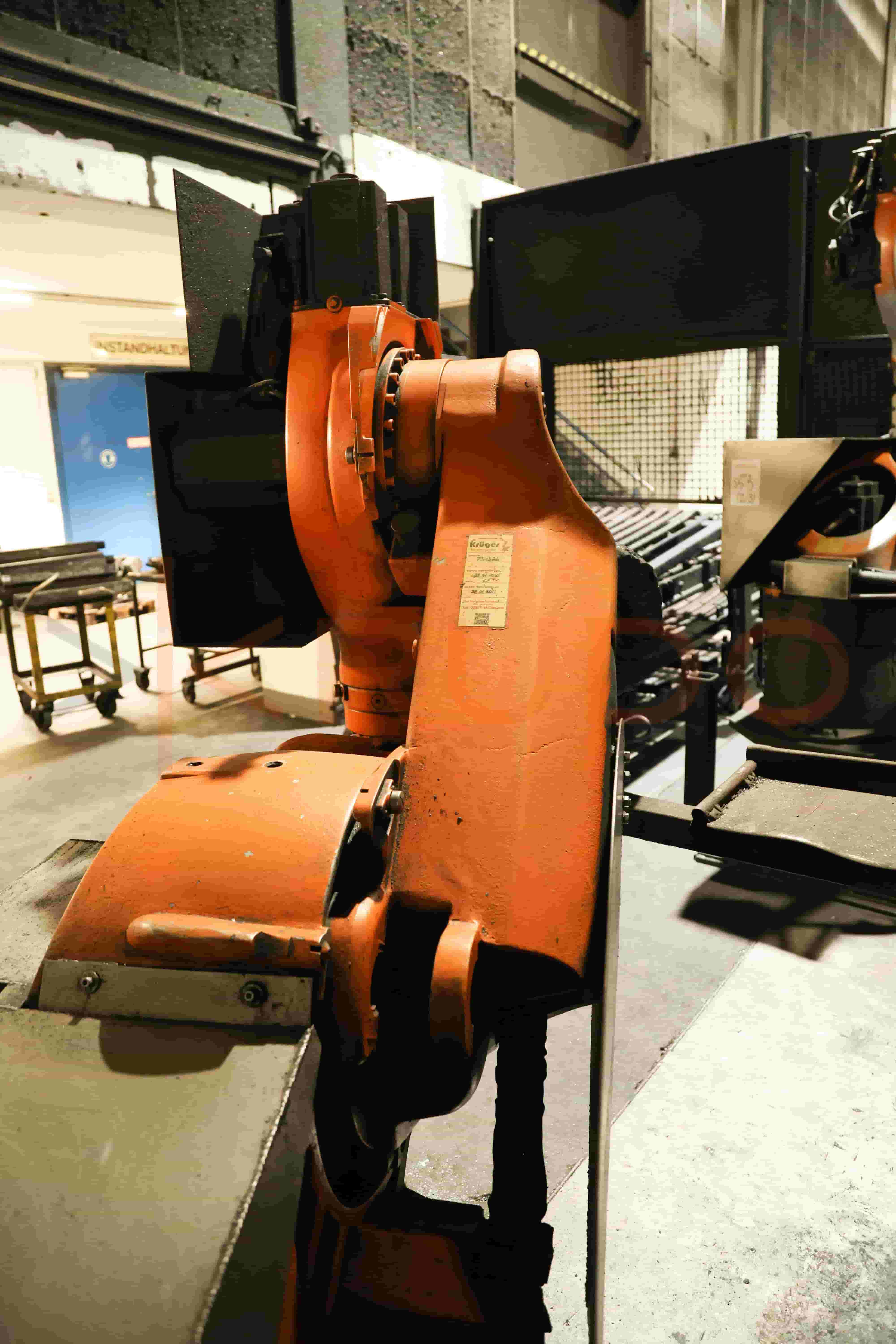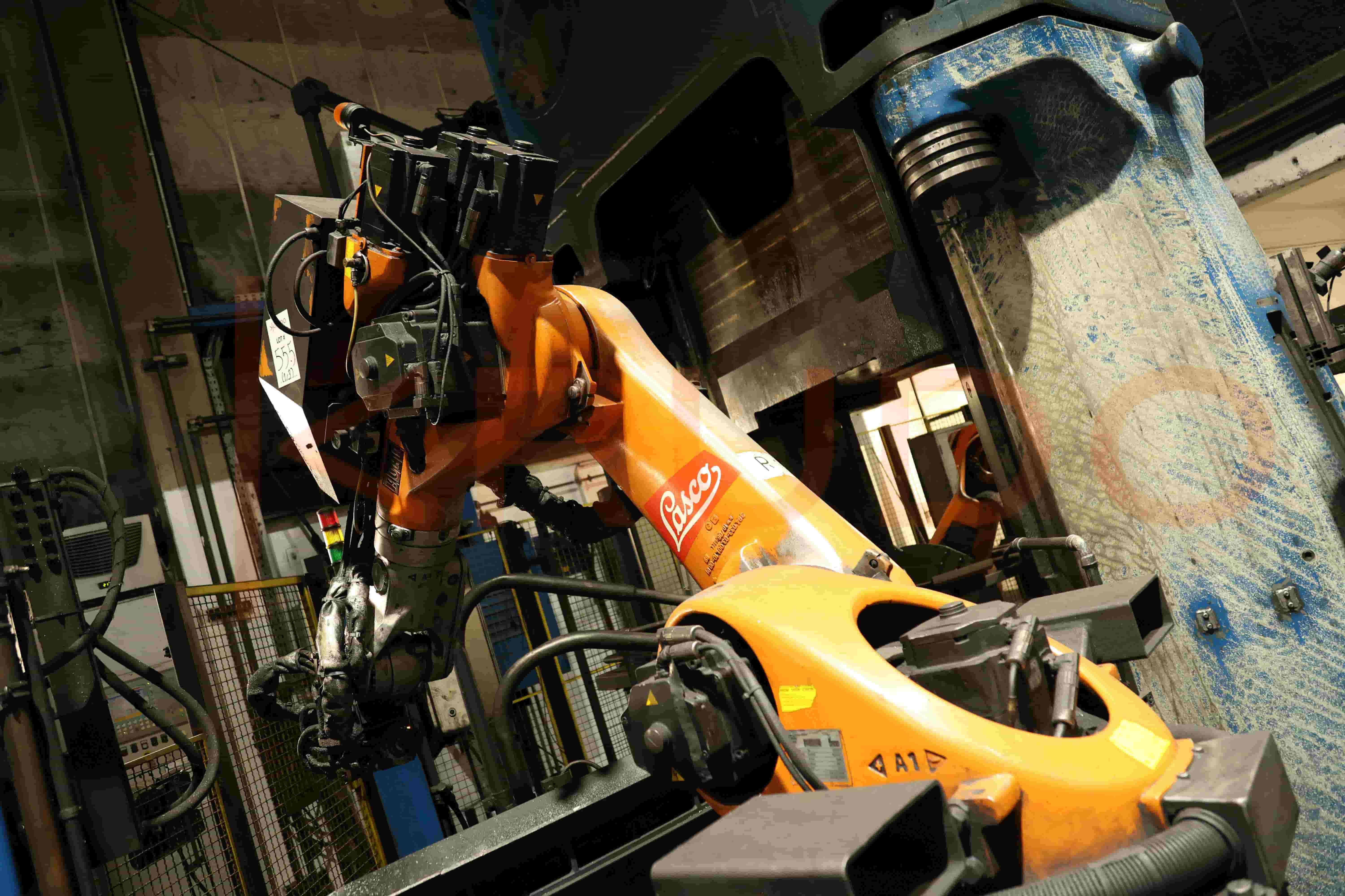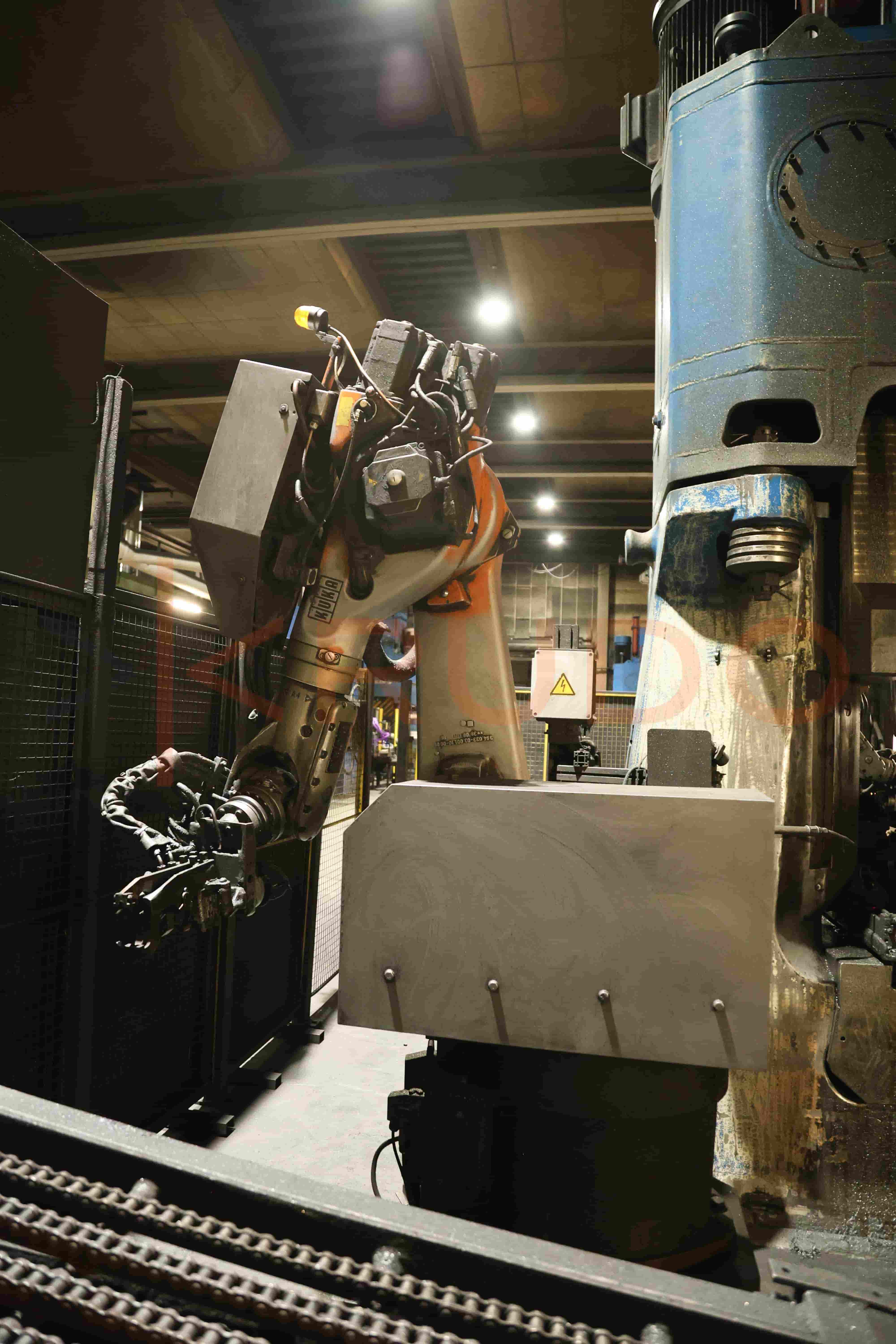 This Lasco automation system integrates and controls all material handling and transfer operations across the forging line. It includes two forging robots (KUKA KR 30-3F) and one discharge robot for part removal (KUKA KR 30/2 with bucket), enabling precise positioning and safe, synchronized operation within the automated forging process.