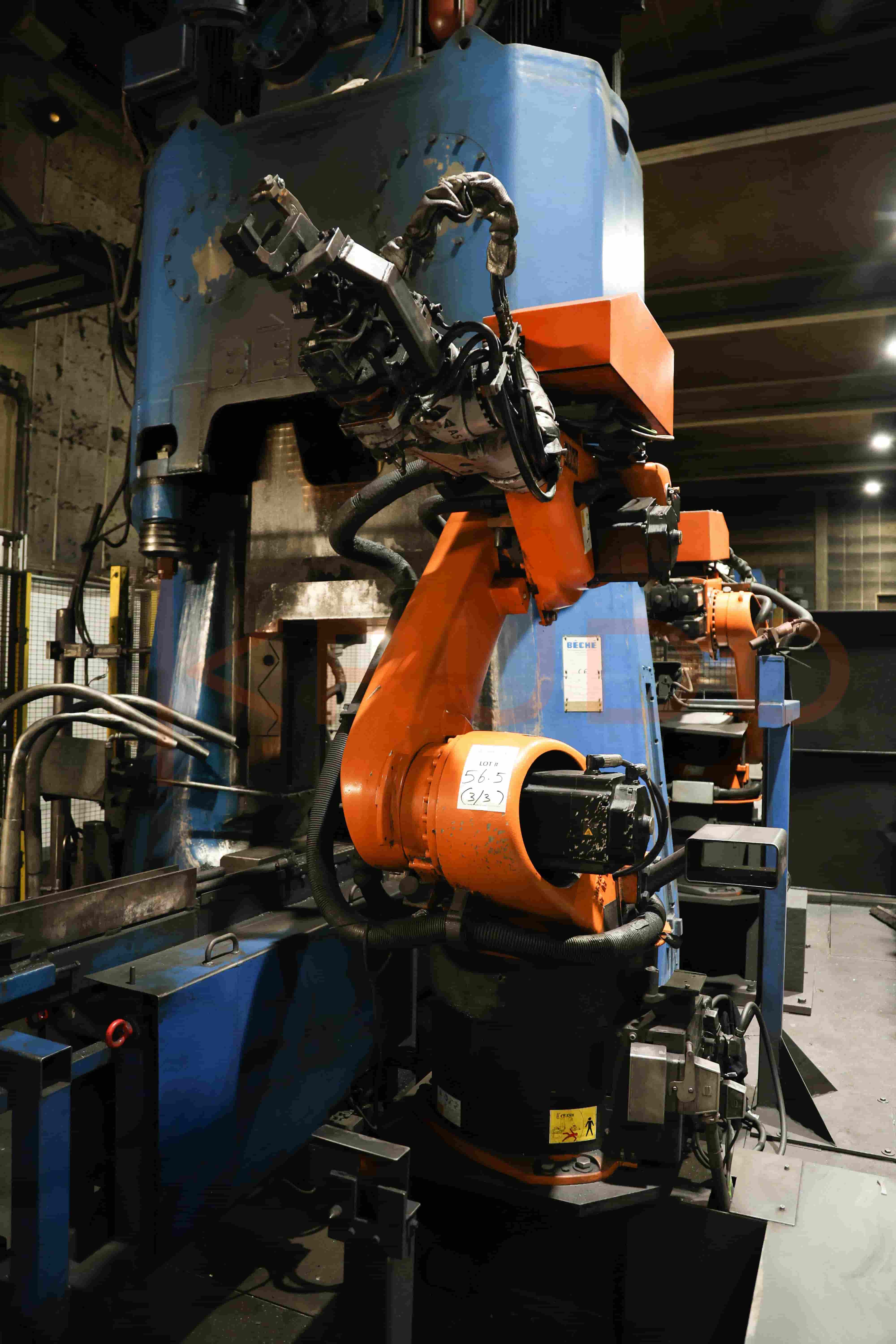 The automation system integrates a forging robot (KUKA KR 60-3F) and an extraction robot (KUKA KR 60-3F) to manage billet transfer, part positioning, and finished part removal.