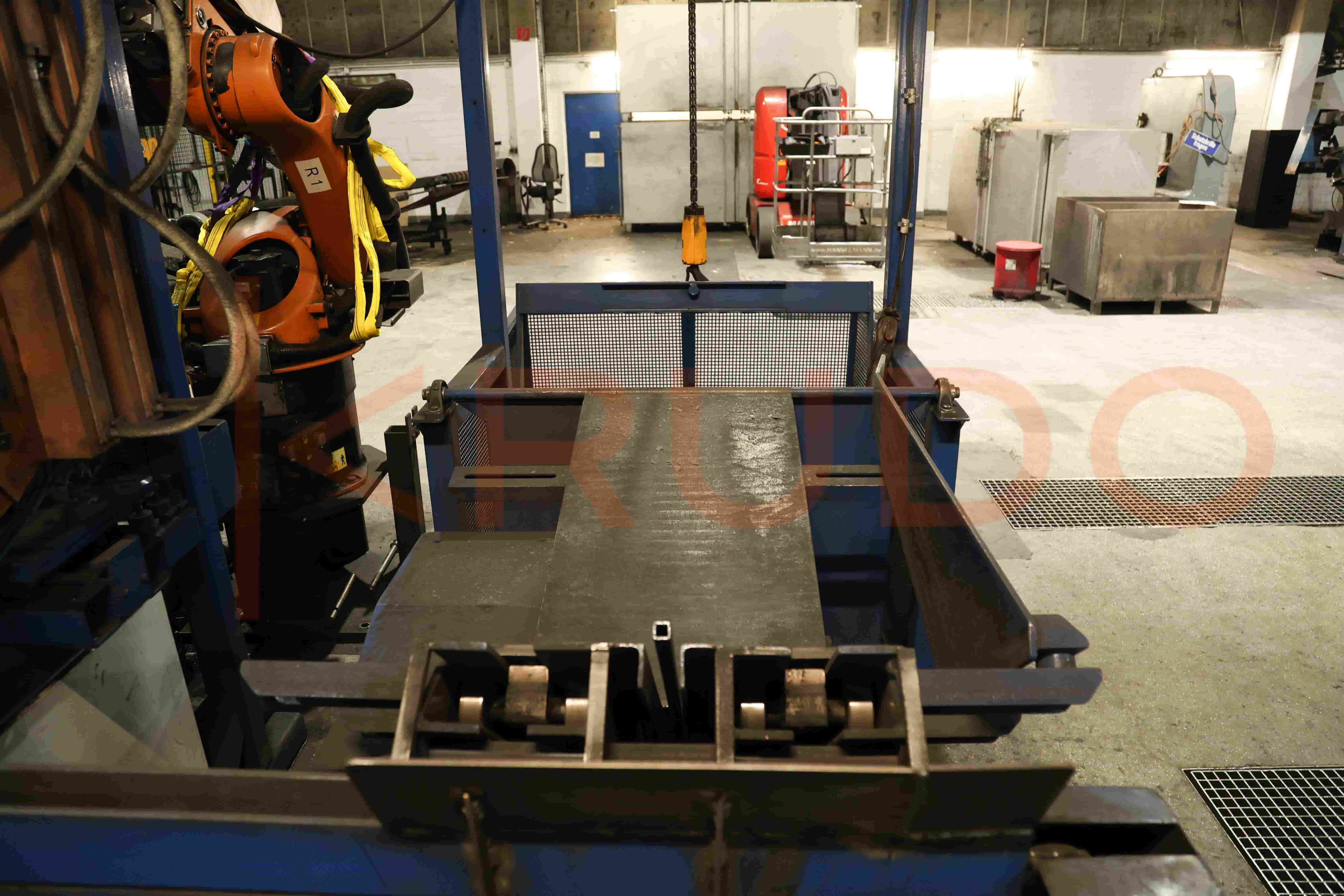 The tilting device ensures precise orientation and controlled handover of heated billets within the forging line.