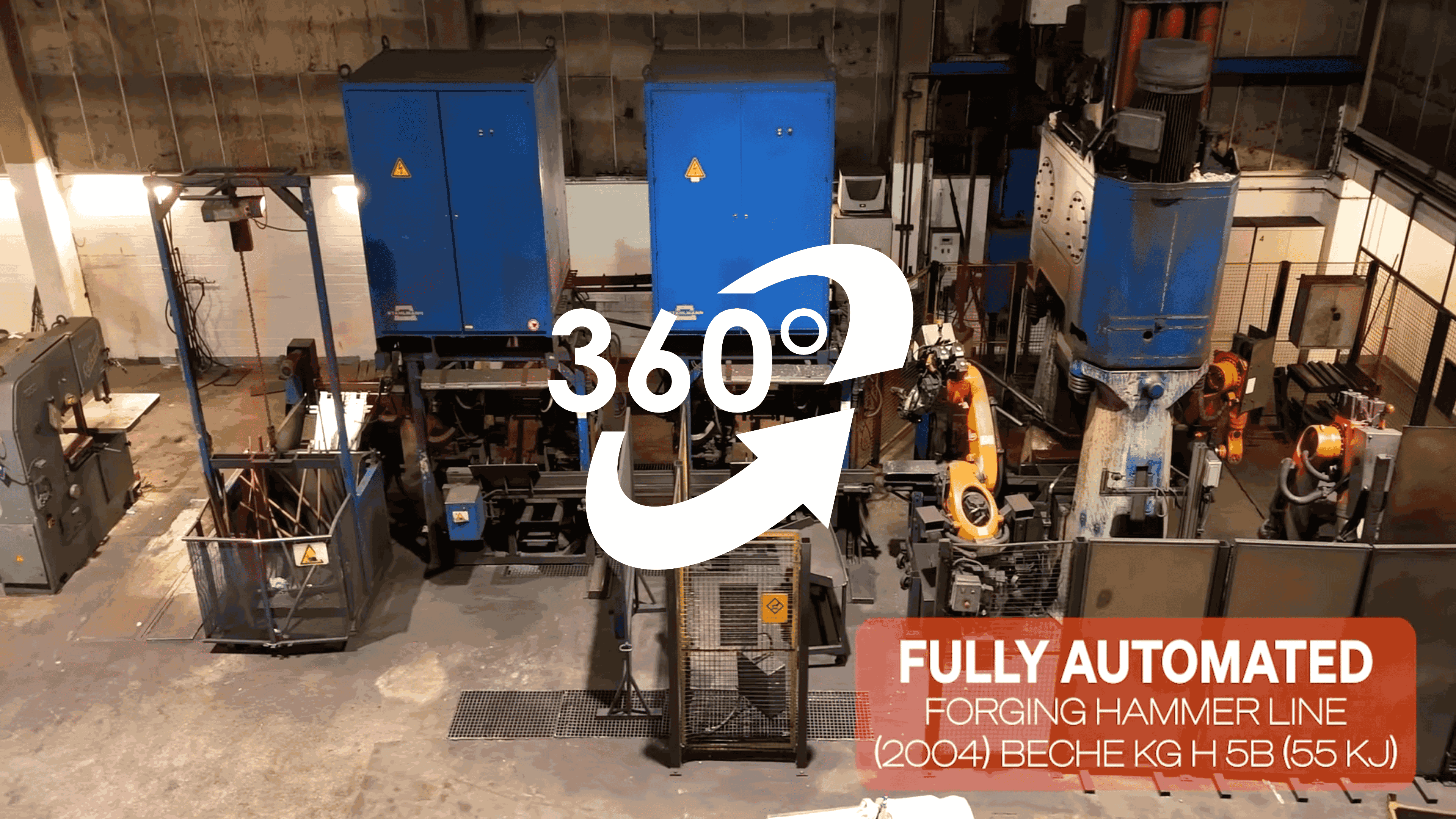 Fully automated forging hammer line featuring a 55 kJ BECHE KG H 5B hammer, tilting device, conductive heating system, reactive power compensation, automation system, 2 forging robots, conveyor belt, control cabinet, and discharge robot.