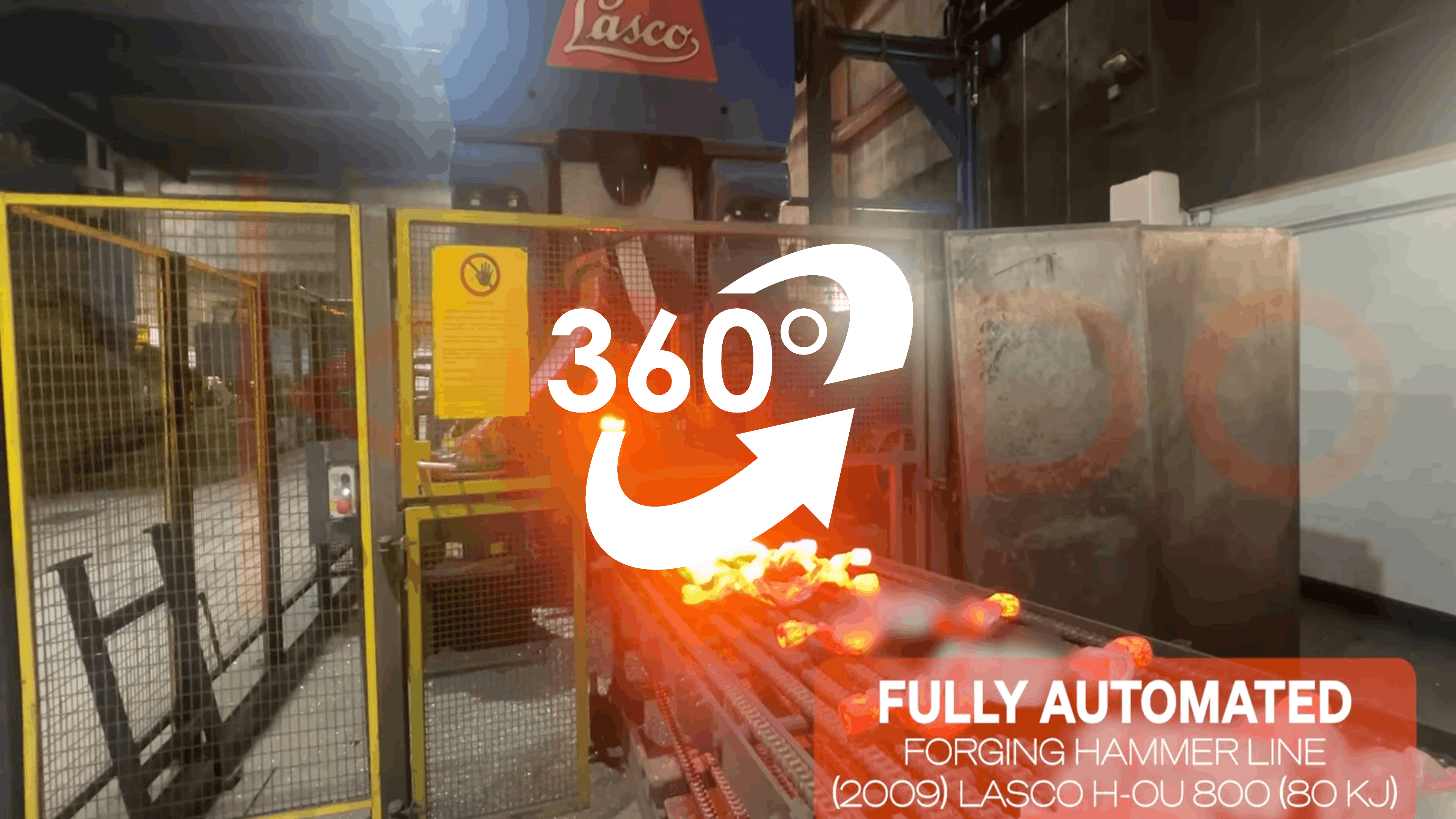 Fully automated forging hammer line featuring a 80 kJ LASCO HO-U 800 hammer, tilting device, induction heating unit, automation unit, 2 forging robots, and picking robot.